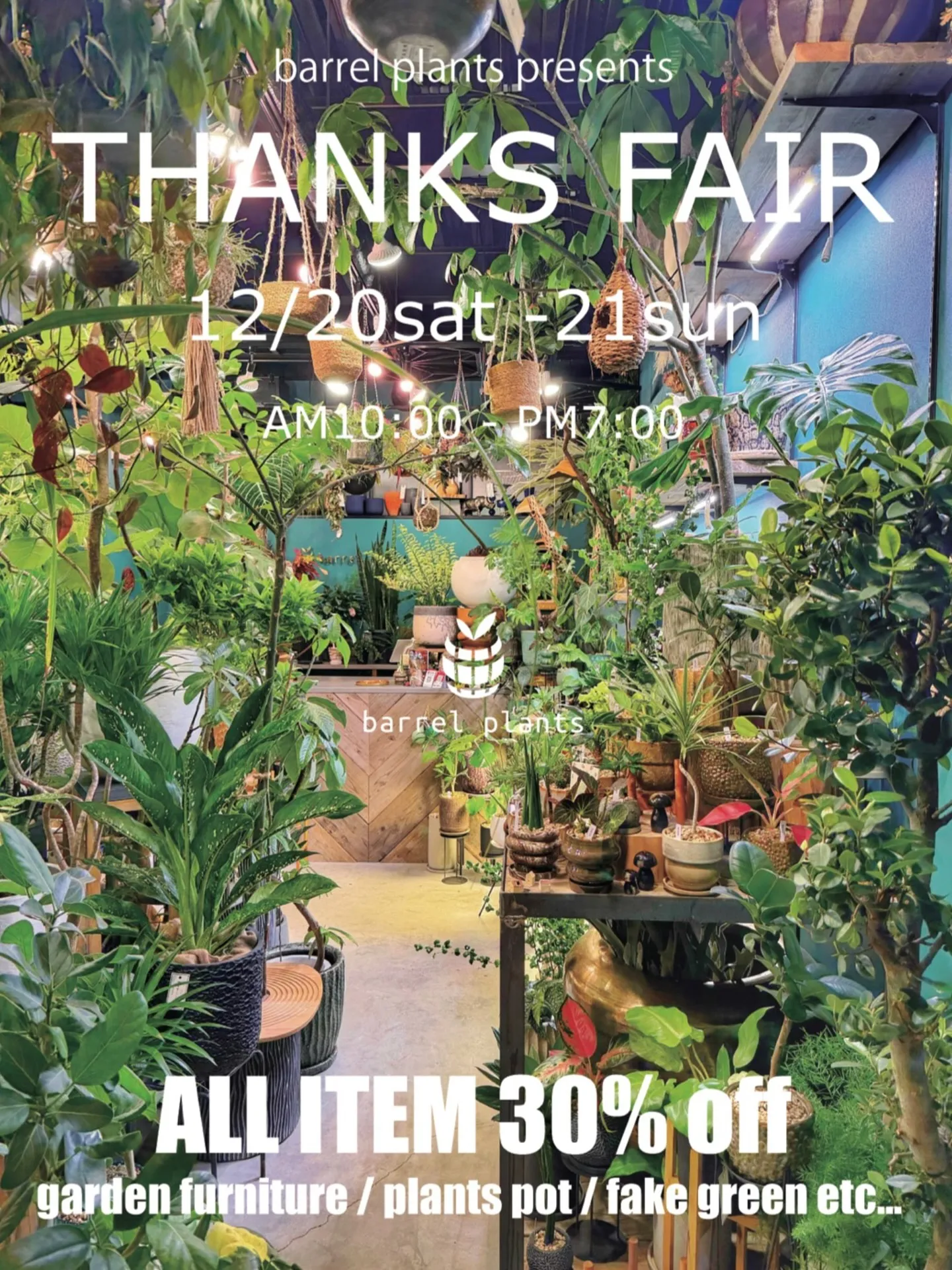 【barrelplantsが期間限定のTHANKS FAIRを開催!店内の全商品30%OFFで、植物もガーデンファニチャーもお得に。”】