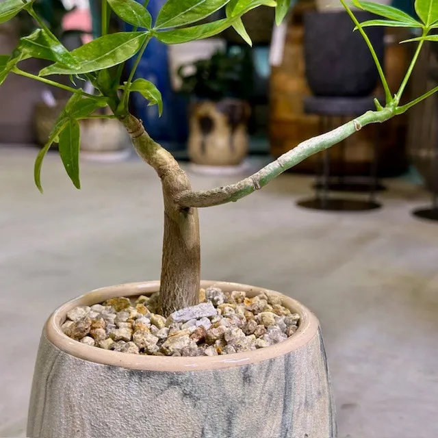 石の鉢との相性も抜群です。1本1本ずつ表情の違うパキラ、ぜひあなたの部屋のワンポイントにいかがでしょうか??(^^)